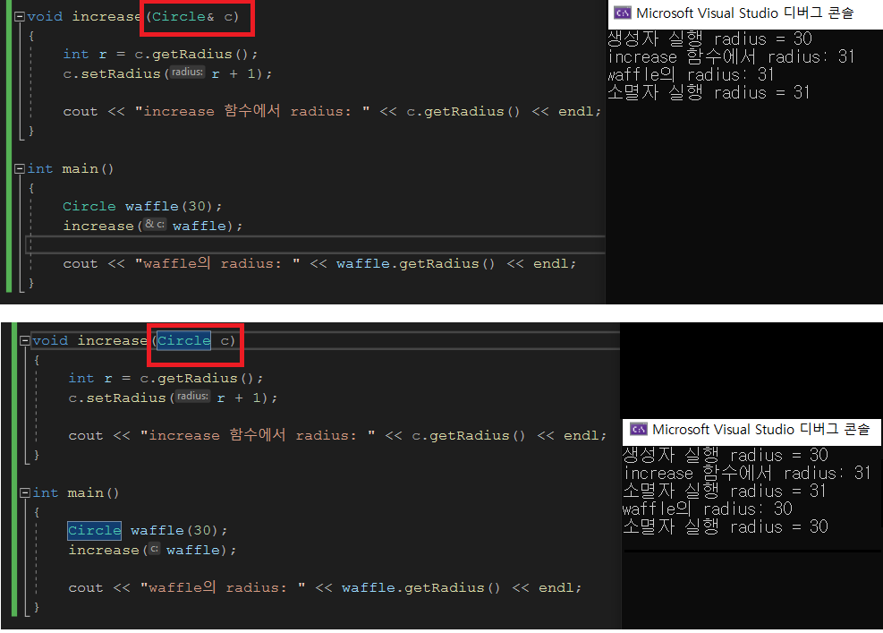 해당 함수의 Circle c는 기존의 waffle의 복사본으로서 값에 의한 호출로 생성된 객체다. 따라서 c의 생성자를 초기화하는 과정은 생략되고, 복사본의 반지름 radius값에 1이 더해진 체 "increase 함수에서 radius : 31"이라는 문구가 출력될 것이다. 그리고 함수가 종료됨에 따라 c가 소멸하고, 소멸자 함수가 실행되어 "소멸자 실행 radius = 31"이라는 문구가 출력된다.