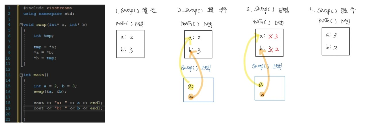 - 정의: 주소를 직접 포인터 타입의 매개 변수에 전달하는 방식