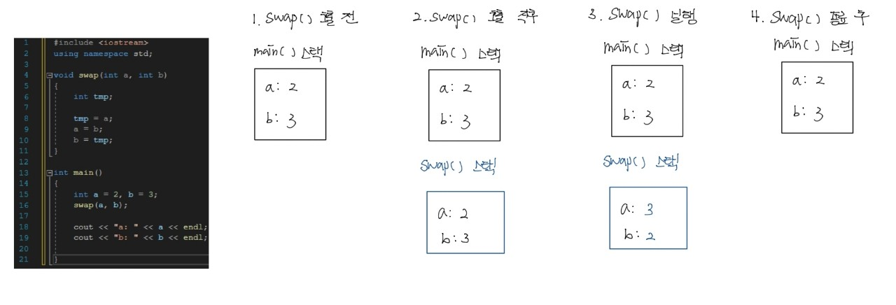 - 정의: 호출하는 코드에서 넘겨주는 실인자 값이 함수의 매개 변수에 복사되어 전달되는 방식