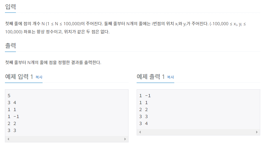 좌표를 오름차순으로 정렬하는 문제다. 이때 x좌표가 동일하다면 y좌표가 증가하는 순서로 정렬해야 한다. 구조체와 연산자 오버로딩을 이용해 데이터가 큰 경우 효율적으로 좌표를 정렬하는 방법이 있고, std::pair<>를 이용해 좌표를 정렬하는 방법이 있다.
