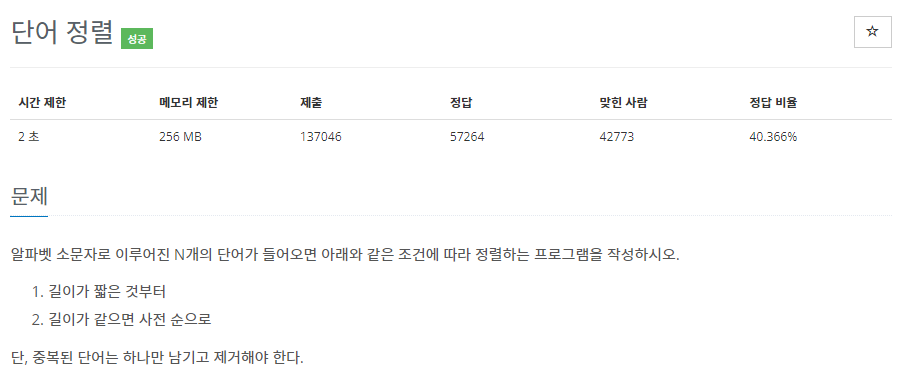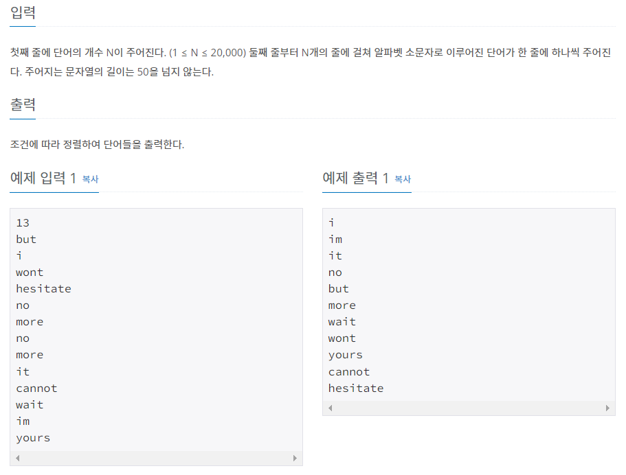 단어를 길이를 기준으로 정렬하는 문제다. std::sort에 비교 구문을 추가하여 해결하면 쉽게 해결할 수 있다.