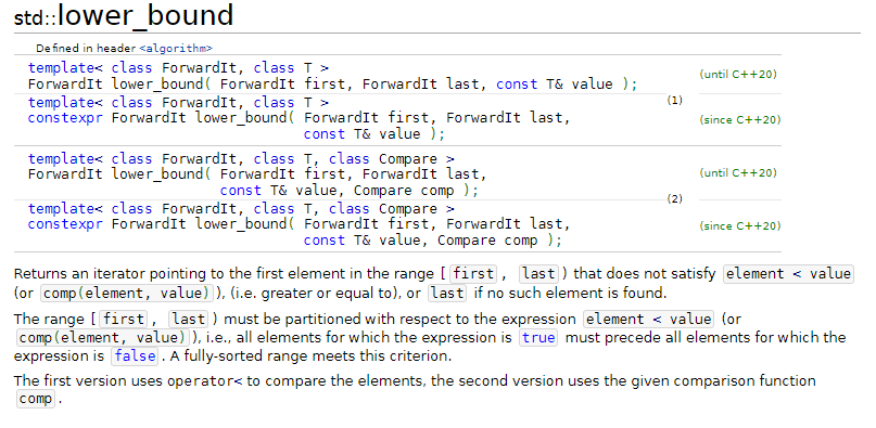 std::lower_bound() 함수는 정렬된 원소에 이진 탐색을 적용하여, 특정 값 이상이 처음 나타나는 위치를 탐색하여 위치를 반환한다. 여기서 특정 값을 찾아낸다는 점에서 'find() 함수를 쓰면 되지 않을까라는 생각'을 하고 적용했었는데, find() 함수는 선형 탐색 방식을 사용하므로 시간 초과가 발생하였다.