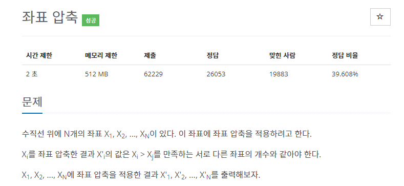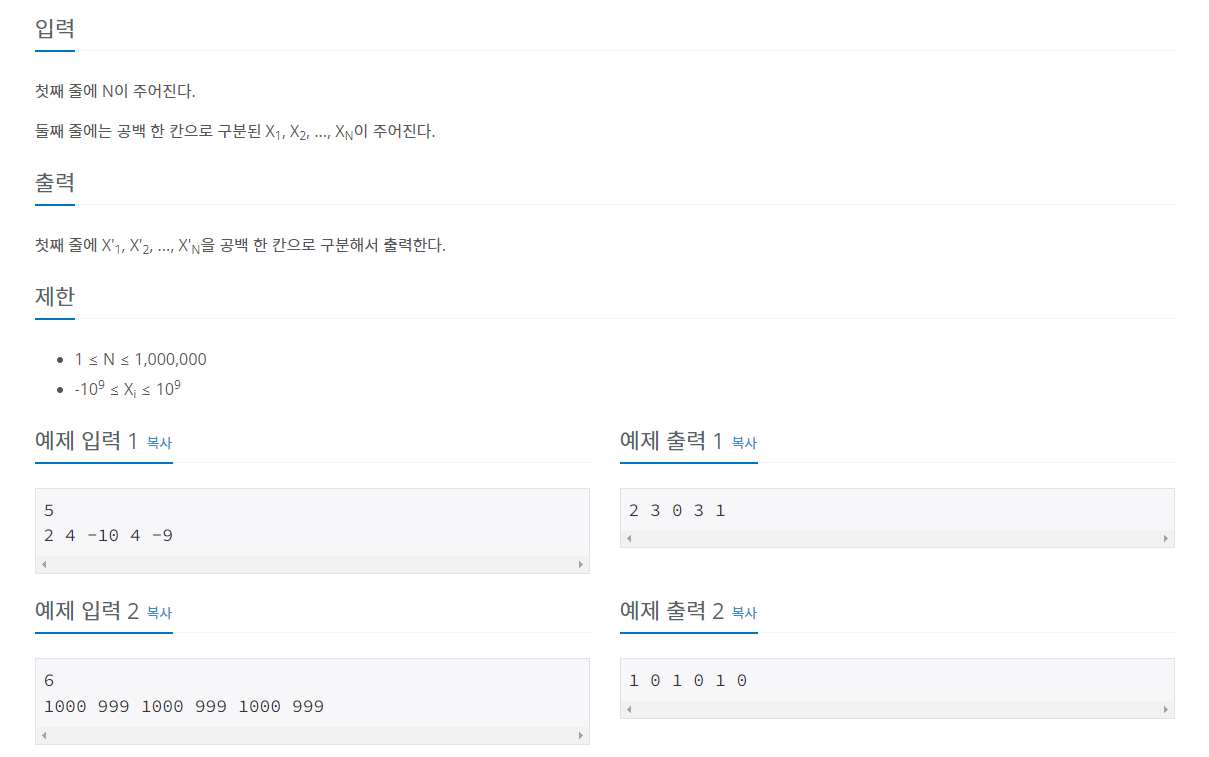 문제를 푸는 데 핵심적인 요소는, 입력으로 받은 좌표 값들을 정렬해서 작은 값부터 차례대로 번호를 매길 수 있다는 것이다. 이때 각 값의 번호는 정렬된 배열에서의 인덱스 값과 일치하는데, 이 인덱스 값을 저장하는 배열을 만들어서 각 좌표 값에 해당하는 인덱스 값을 찾아 출력하면 문제를 해결할 수 있다.