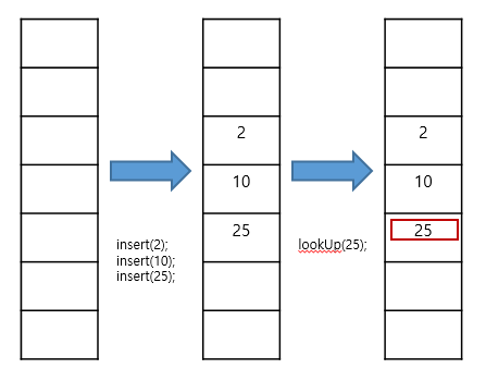 크기가 7인 해시 테이블을 만들고 2, 10, 25를 테이블에 넣은 후 25란 값을 찾는 과정이다. 여기까진 큰 문제가 없다.