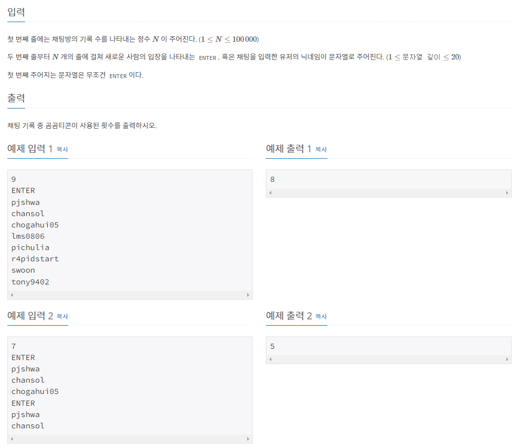 ENTER가 입력된 이후의 집합의 크기만큼 count에 더해주고 m을 비우면 중복되지 않은 유저의 숫자가 count에 더해진다. 이를 이용해 count의 개수를 조절하면 답을 구할 수 있다.