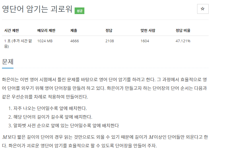 주어진 문자열을 빈도수 → 길이순 → 알파벳 순으로 정렬하는 문제다. 자료구조 맵을 이용해 특정 길이 이상의 문자열을 빈도수와 함께 컨테이너에 저장한 후, 주어진 조건에 맞게 정렬하면 문제를 해결할 수 있다.