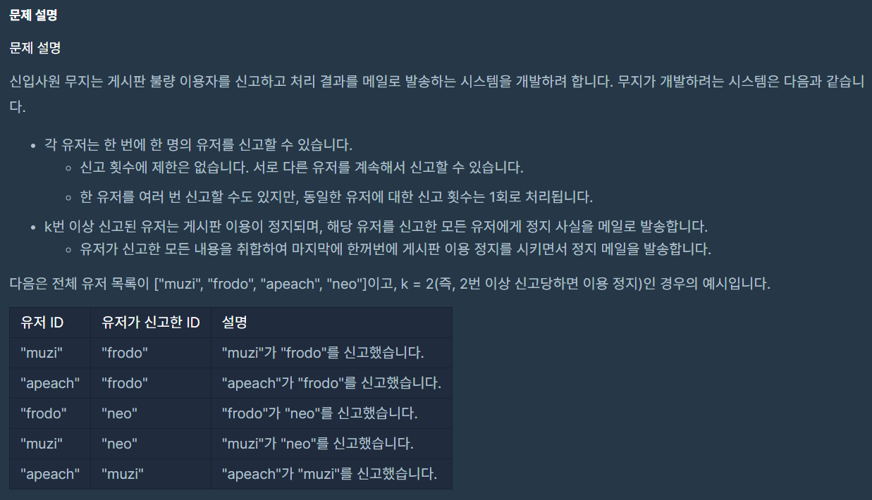 문제 설명 제한 사항 및 입출력 예제 개념 id_list에 포함된 사용자가 신고 결과 이메일을 얼마나 많이 받았는지 파악하는 문제다. 각 신고 처리 내역은 "신고자 신고할 사람"의 형식으로 제시된다. 단, 본 문제에서 핵심적인 고려 사항은 동일한 사용자에 대한 중복 신고가 단 한 번의 신고로만 처리된다는 점이다. 따라서, 동일한 대상에 대한 다수의 신고가 있더라도 이를 단일 신고로 간주하며, 이는 신고 결과 이메일의 수를 결정하는 데 중요한 요소가 된다는 점을 놓치면 안 된다. 따라서 map 자료구조를 활용하여 "신고자" "신고한 사람"의 형태의 쌍을 받아 처리할 수 있다. 각 신고자를 키로 설정하고, 신고한 사람을 값으로 설정한다. 동일한 신고자가 동일한 신고한 사람을 여러 번 신고하더라도, map 구..